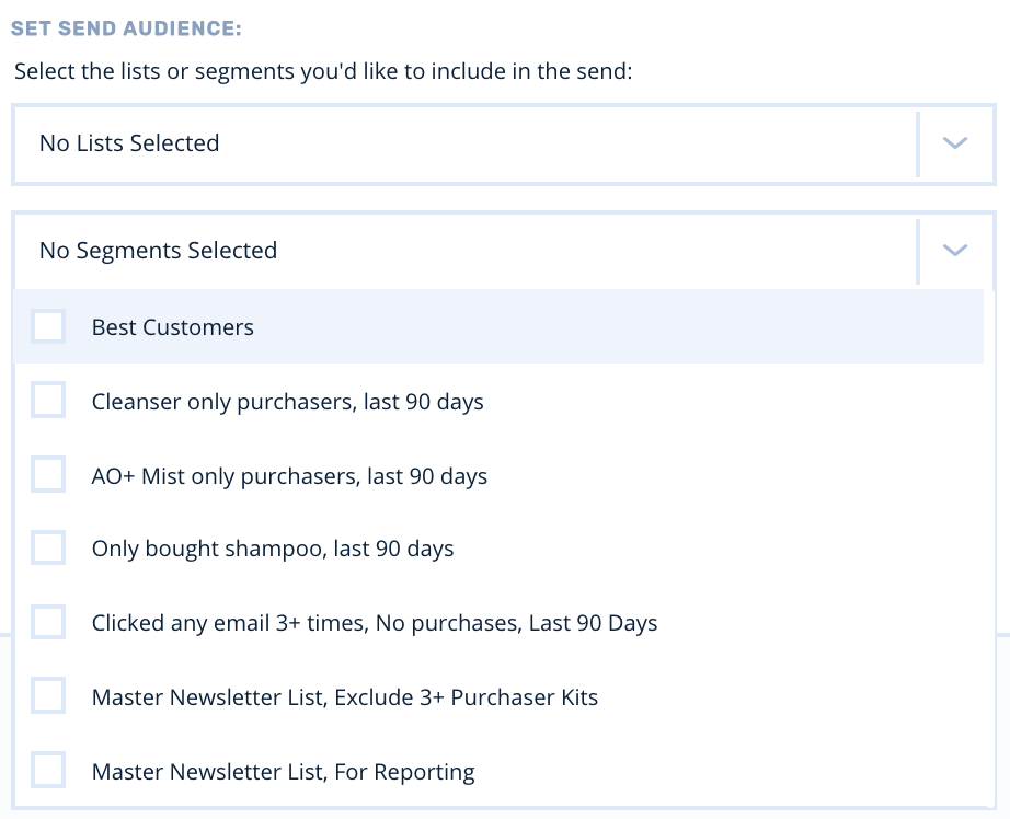 Start by building a new broadcast. You’ll notice an option to select a segment, in addition to selecting a list. You can select any combination of lists and segments and the platform will deduplicate prior to send: